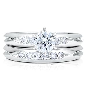 This captivating and different solitaire 2-pcs ring set is made of fine sterling silver, plated with rhodium, and stamped with a 925 quality mark. Striking prong set round AAA grade cubic zirconia center stone weighs 0.66 carat, 5.5mm. Accented with 10 pave set round cubic zirconia sidestones that weigh 0.24 carat in total. Each ring measures 3.5mm. Style number #r257-2-9.